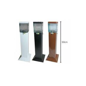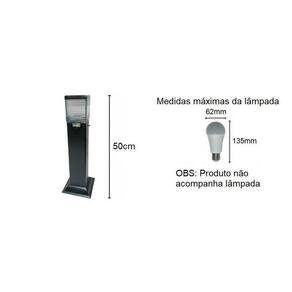 Especificações Técnicas: Altura: 50cm; Dimensões da base: 15,8cm x 15,8cm; Dimensões do corpo: 9cm x 9cm Base e chapéu injetado em material termoplástico de alta resistência; Lente em vidro; Soquete em porcelana para 01 lampada - bocal E-27; Bocal E27; Comporta lampada de até 62mm de largura e 135mm de altura; Corpo em PVC tratado; Cor: Preto; Peso: 1,170kg Potência máxima 60W; Tensão máxima 220V; Fixação: 04 furações para fixação da base no solo; Somente para lâmpadas eletrônicas ou led. Marca: NYLUX