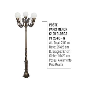- Itens Inclusos: 01 Poste Paris Menor P/ Jardim de Alumínio 05 Globo 2,51m