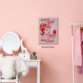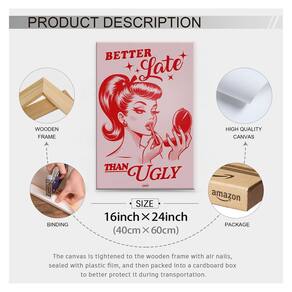 Transforme seu espaço em um refúgio chique com nossa coleção de decoração de parede "Better Late Than Ugly". Abrace a elegância com nossa elegante arte de parede rosa, adicionando um toque de glamour a qualquer sala de maquiagem. Descubra peças de arte de parede modernas que combinam estética moderna com beleza atemporal. Eleve sua decoração e inspire sua rotina diária com nossa seleção selecionada, projetada para refletir seu senso de estilo único. - Arte de parede divertida: O tamanho da arte de parede feminina é de 40,6 x 61 cm, esta arte de parede pin up girl é embrulhada e esticada sobre moldura de madeira, para criar um efeito 3D imersivo que faz a obra de arte parecer ótima - Cartazes duráveis e de alta qualidade: arte de parede Pin up girl Use tinta de proteção ambiental de alta qualidade, não desbota facilmente, cores vivas, à prova d'água, resistente a UV, sem odor. Os pôsteres de garotas gostosas adicionarão um toque de estilo e personalidade às suas paredes - Decoração de parede moderna: Abrace a elegância com nossa arte de parede rosa elegante, adicionando um toque de glamour a qualquer sala de maquiagem. Decoração de parede feminina que pode fornecer decoração para cozinha, sala de jantar, bar, dormitório, sala de estar, quarto, apartamento, hotel, sala de beleza, sala de maquiagem - Presente para meninas: transforme seu espaço em um refúgio chique com nossa coleção de decoração de parede "Better Late Than Ugly". Seja dado como aniversário, Natal, presente de férias, inauguração de casa ou qualquer outra ocasião especial, a arte de parede rosa surpreenderá e encantará o destinatário - Serviço pós-venda: Valorizamos muito sua experiência de compra, se você tiver algum problema com a arte de parede retrô, por e-mail na primeira vez. Esperamos resolver quaisquer problemas que você possa encontrar de forma rápida e eficiente