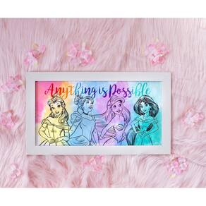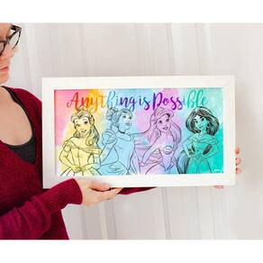 Silver Buffalo Disney Princesa Bela, Cinderela, Ariel e Jasmine Anything is Possible Arco-íris Aquarela Esboço Emoldurado MDF Arte de Parede Decoração de Quarto, 25,4 x 45,7 cm - Arte de parede: a exibição apresenta as icônicas princesas da Disney Bela, Cinerela, Jasmim e Ariel com texto inspirador que diz "Anything is Possible" em detalhes e qualidade impressionantes - FÁCIL DE PENDURAR: Vem com ferragens para pendurar placa de dente de serra para que você possa exibir seu fã da Disney o mais perfeitamente possível - Tamanho perfeito: a arte de parede mede 25,4 x 45,7 cm e pode ser facilmente exibida em sua casa, escritório ou torre de castelo - Licenciado oficialmente: tenha confiança sabendo que você está comprando uma arte de parede oficialmente licenciada da Princesa Disney da Silver Buffalo - Um ótimo presente: esta arte de parede é um ótimo presente para todas as princesas da Disney em sua vida; seja para meninas, meninos, crianças ou adultos, cada uma pode agora ter uma lembrança do reino mágico em sua casa ou escritório