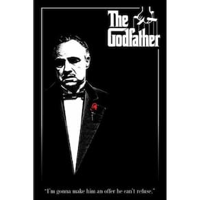 - Pôster icônico do filme com Marlon Brando como The Godfather, com detalhe marcante de uma rosa vermelha.