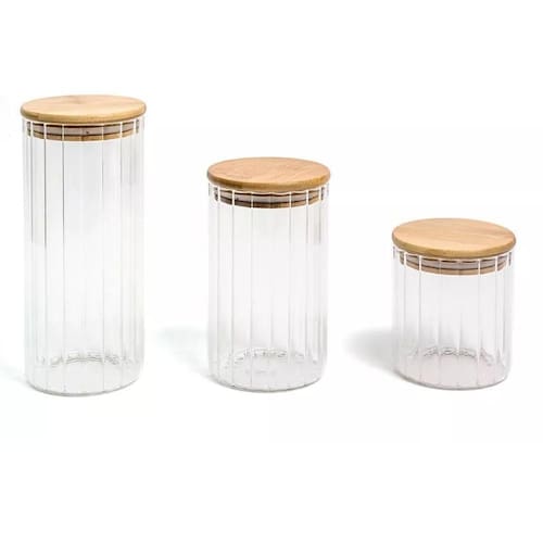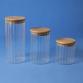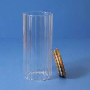 Esse é o pote 1100ml de vidro canelado com tampa de bambu de mantimento da OIKOS.