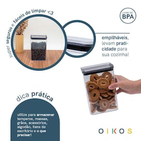 ele é empilhável, durável, possui design moderno e é super versátil! perfeito para armazenar alimentos, temperos, algodão, itens de escritório e o que precisar! além disso, é mestre na conservação: o anel de silicone na tampa garante uma vedação total do pote, conservando os alimentos por muito mais tempo.