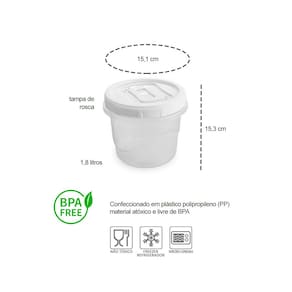 Contêm 1 Pote com tampa Capacidade: 1,8 Litros Dimensão: 15,1 x 15,3 cm Material: Plastico Polipropileno