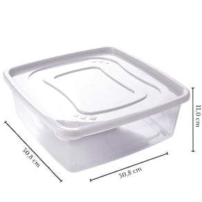Conjunto com 3 potes de plástico quadrados com tampa, sendo cada um com capacidade para 6,6 litros. São produzidos em polipropileno de alta resistência e durabilidade e material atóxico livre de bisfenol (BPA Free). Podem ser levados ao freezer e micro-ondas.