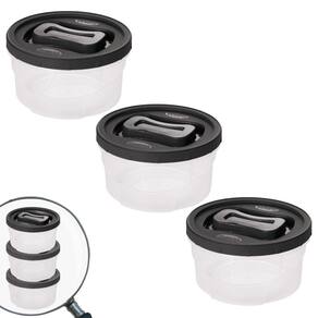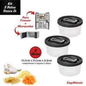 Conjunto com 3 potes de plástico redondos com tampa de rosca, sendo cada um com capacidade para 2 litros. São produzidos em polipropileno de alta resistência e durabilidade e material atóxico livre de bisfenol (BPA Free). Podem ser levados ao freezer e micro-ondas. Cada um deles comporta uma porção generosa dos mais variados tipos de alimentos do dia a dia e seu tamanho é ideal para as sobras das refeições.