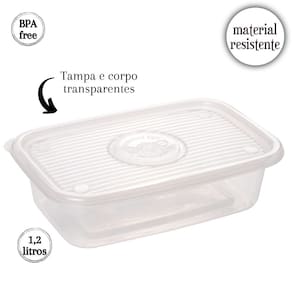 Conjunto com 18 unidades. Recipiente plástico com capacidade para 1,2 litros. Possui tampa translúcida para facilitar a identificação do conteúdo. É produzido em material atóxico e livre de BPA. Pode ser levado ao freezer e ao micro-ondas. Material: polipropileno Capacidade: 1,2 litros Comprimento: 23,6 cm / Largura: 15,7 cm / Altura: 6,7 cm