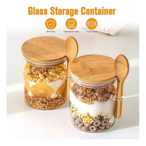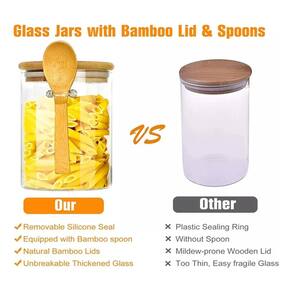 Conteúdo da Embalagem - Pote de vidro - Tampa de bambu com vedação de silicone - Colher de bambu