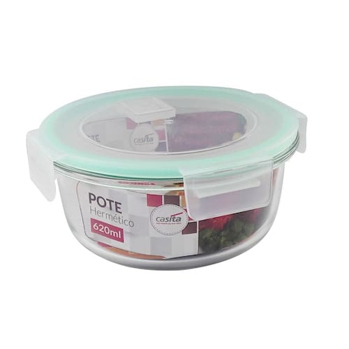 Pote Hermético Redondo De Vidro 620ml com Tampa CA12653 CasitaCARACTERÍSTICAS:- Os potes da linha Casita são versáteis para a cozinha, servindo para organizar mantimentos e guardar alimentos. O pote hermético redondo, com capacidade para 620 ml, é ideal para conservar sobras de refeições na geladeira.- Fabricado em vidro borosilicato, um material termo-resistente e robusto, que evita manchas e odores, além de facilitar a limpeza. O material não contém BPA. O recipiente pode ser utilizado em forno, freezer, geladeira, micro-ondas e lava-louças, resistindo a choques térmicos e a temperaturas de até 400°C. A tampa hermética veda completamente o recipiente e mantém os alimentos frescos por mais tempo.- O sistema de travas nos quatro lados oferece segurança e previne vazamentos.LIMPEZA:- Lavar com detergente neutro, esponja macia e secar imediatamente. Não é recomendado lavar em máquinas, nem utilizar produtos químicos.ESPECIFICAÇÕES:- Marca: Casita- Referência: CA12653- Capacidade: 620 ml- Material: Vidro Borosilicato- Cor: Transparente- Dimensões: Ø 15 x 15 x 6,7 cm- Peso: 575 gCONTEÚDO DA EMBALAGEM:1 Pote Hermético Redondo De Vidro 620 ml