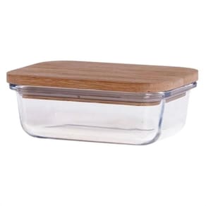 Pote retangular de vidro borossilicato com tampa de bambu e silicone de vedação. Seu formato retangular e empilhável ajuda a aproveitar melhor o espaço. com a combinação da vedação de silicone e o bambu anti bactericida, esse pote é perfeito para armazenar alimentos.