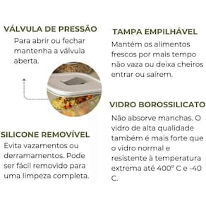 Cozinhe no forno ou air fryer até 220°C Leve ao freezer para congelar alimentos Aqueça sua comida no micro-ondas com a válvula de respiro aberta Pode ser levado a lava-louças para facilitar a limpeza O vidro borossilicato evita manchas e odores Fabricado em material livre de BPA