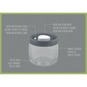 Pote De Vidro Tramontina Purezza Com Tampa Plástica A Vácuo 0,4 L Tramontina Pote de Vidro Tramontina Purezza com Tampa Plástica a Vácuo 0,4 L Tramontina - Tenha toda a praticidade e tecnologia dos produtos Tramontina dentro da sua cozinha! Com o Pote de Vidro Tramontina Purezza com Tampa Plástica a Vácuo 0,4 L você conserva os alimentos de uma maneira muito mais prática e eficaz. Perfeito para conservar o sabor e os nutrientes dos alimentos como cereais, grãos, biscoitos e frutas, ele retarda a oxidação e mantém sua durabilidade. Possui capacidade para 0,4 litros e é altamente durável e resistente. Garanta o melhor para sua casa! Características Gerais do Produto: Garantia: - 90 dias de garantia legal para defeitos de fabricação