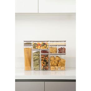 A vedação hermética impede vazamentos e a entrada de ar, mantendo frescor e qualidade. Com uma capacidade de 1,8 L, é perfeito para armazenar 2 caixas de espaguete ou 1 pacote grande de biscoito. O pote Modo é livre de BPA e fácil de limpar. Não é adequado para micro-ondas, freezer ou lava-louças
