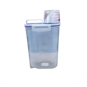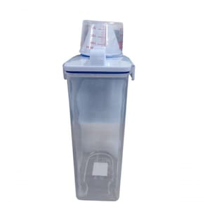 Seu design inteligente conta com tampa hermética e vedação em borracha azul, que protege o conteúdo da umidade, poeira e até pragas como insetos e roedores. Além disso, o recipiente é transparente, o que permite visualizar o conteúdo facilmente e controlar o nível de abastecimento sem precisar abrir. O copo medidor integrado, com marcações claras (1 - 3/4 - 1/2 - 1/4 - 50ml - 100ml - 150ml - 180ml), é rosqueável sobre o bico de despejo, facilitando o controle de porções e evitando desperdícios. A alça ergonômica garante mais conforto ao manusear e transportar.