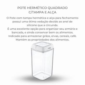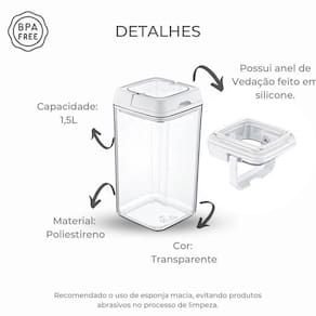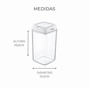 O Pote com tampa hermética e alça para fechamento possui uma ótima vedação devido ao anel desilicone que a circunda.É uma excelente opção para organizar seu armário e bancada, e ainda conservar bem os alimentos.Indicado para armazenar grãos, ervas, cereais, café.Mantém as propriedades dos alimentos.Não contém bpa.Também pode ser utilizado no armazenamento de outros objetos;Fácil de lavar, material resistente e sua transparência facilita identificação do conteúdo.Características:Medidas:Profundidade: 10.5cmLargura: 10.5cmAltura: 19.5cmEspecificações Técnicas:Matéria-prima: PoliestirenoCor/acabamento: BrancoCapacidade: 1,5l