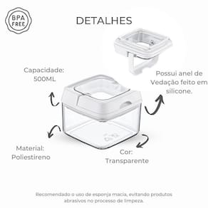 Pote Hermetico Quadrado 500Ml Tampa Alça P/Fechamento Nobre