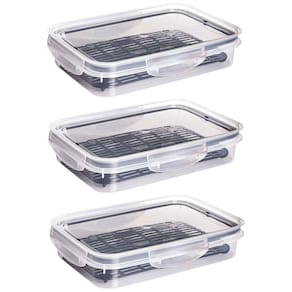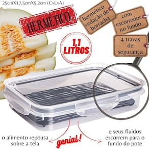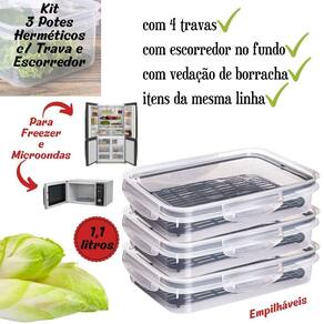 Conjunto com 3 potes plásticos com capacidade para 1,1 litros. Possuem silicone na tampa e travas laterais para uma melhor vedação e conservação do alimento. Seu escorredor inferior mantém os alimentos longe do contato com resíduos que podem se formar no fundo. Produzido em material atóxico, pode ser utilizado no freezer e no micro-ondas.