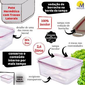 Pote plástico com capacidade para 2,6 litros. Possui silicone na tampa e travas laterais para uma melhor vedação e conservação do alimento. Produzido em material atóxico, pode ser utilizado no freezer e no micro-ondas.Diferenciais:- Modular e Empilhável: otimiza espaço em seu armário.- Tampa transparente: ótima organização em gavetas.- Vedação com borracha: vida longa aos alimentos.- Travas de fechamento: segurança ao fechar e abrir.- Livre de bisfenol-A (BPA FREE).Material: polipropileno e tampa com siliconeCapacidade 2,8 litrosComprimento: 25 cm / Largura: 17 cm / Altura: 10 cm Marca: Não Informado