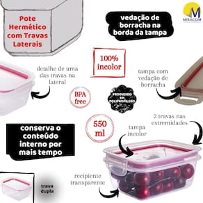 Pote plástico com capacidade para 550ml. Possui silicone na tampa e travas laterais para uma melhor vedação e conservação do alimento. Produzido em material atóxico, pote ser utilizado no freezer e no microondas.Diferenciais:- Modular e Empilhável: otimiza espaço em seu armário.- Tampa transparente: ótima organização em gavetas.- Vedação com borracha: vida longa aos alimentos.- Travas de fechamento: segurança ao fechar e abrir.- Livre de bisfenol-A (BPA FREE).Material: polipropileno e tampa com siliconeCapacidade 0,55 litrosComprimento: 15 cm / Largura: 12 cm / Altura: 7 cm Marca: Não Informado