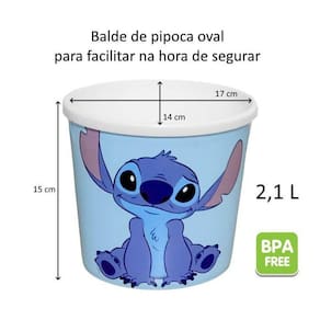 Pote para Pipoca Balde Grande Estampado Lilo Stitch 2.1L Plasútil Pote Balde de Pipocas Clássico Stitch Oval 2,1 Litros - Plasútil Este recipiente de pipocas vai lhe acompanhar nos momentos mais emocionantes do filme, com acabamento premium e material de excelente qualidade o produto atende as expectativas e dá um toque especial para o clima de cinema. É personalizado com o Stitch do filme Lilo & Stitch, possui 2,1 Litros e tem o formato oval que facilita na hora de segurar e não derrubar as pipocas. Chame a família e os amigos e bom filme! Especificações: Marca: Plasútil Referência: 15833 Tamanho: 17 x 14 x 15 cm (C x L x A) Capacidade: 2,1 Litros Material: Plástico Produto atóxico. Livre de BPA. Itens Inclusos: 1x Pote de Pipoca Stitch 2,1 L Informações complementares Marca Plasutil Marca: Plasultil