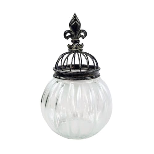 Pote Potiche Decorativo Flor De Lis Ferro E Vidro 25x16cm Elegância e Sofisticação: Potiche de Vidro com Tampa de Ferro e Flor de Lis em Resina