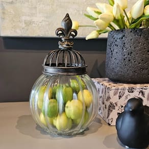 Potiche de vidro transparente Tampa de ferro com flor de lis em resina Estilo clássico e sofisticado Beleza e funcionalidade na decoração