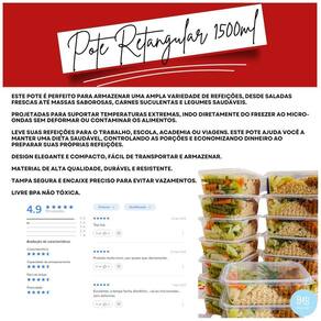 Na compra desse produto, você recebe 10 unidades de potes e 10 unidades de tampas. As medidas externas do pote são 198,2x152,5x86mm e as medidas internas são 154x108.3x34,5mm. O material utilizado é o polipropileno pp e a capacidade de cada pote é de 1500ml.