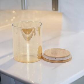 Capacidade: 750ml e 550ml Tamanho aproximado do item de 750ml: 12x9,6cm Tamanho aproximado da embalagem: a:14,5xl:10,5xp:10,5cm Peso aproximado: 340g Tipo de produto: pote liso redondo com tampa hermetica Cor: ambar com tampa marfim Composição: vidro e bambu