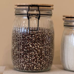 Design Versalhes: O elegante padrão listrado do vidro confere um toque refinado e exclusivo ao pote, elevando o nível da decoração da sua cozinha.