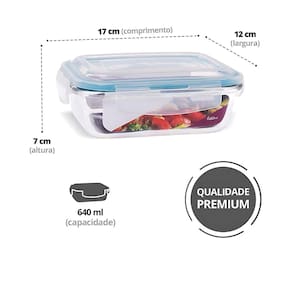 Pote Vidro Retangular 640ml Hermético Travas Quality House Mantenha sua cozinha organizada e seus alimentos sempre frescos com o Pote Vidro Retangular 640ml da Quality House. Feito em vidro borosilicato extra resistente, este pote é ideal para quem busca praticidade, segurança e durabilidade no armazenamento de alimentos. Com uma tampa hermética equipada com 4 travas e anel de vedação em silicone, este pote assegura a conservação dos alimentos, evitando vazamentos e mantendo o frescor por mais tempo. Diferenciais do Produto: - Vidro Borosilicato Extra Resistente: Material que suporta mudanças bruscas de temperatura e choques, garantindo a durabilidade e longevidade do produto. - Tampa Hermética com Travas: Com um sistema de vedação em silicone, o pote evita vazamentos e preserva o sabor e frescor dos alimentos. - Versatilidade e Segurança: Pode ser em lava-louças e micro-ondas, proporcionando praticidade no aquecimento e na limpeza. - Design Compacto e Moderno: Empilhável e elegante, ideal para otimizar espaço na sua cozinha. Ficha Técnica: - Produto: Pote Vidro Retangular 640ml Tampa Hermética Travas Quality House - Material: Vidro Borosilicato, Silicone, Plástico - Capacidade: 640ml - Formato: Retangular - Dimensões: 7cm x 13cm x 18cm - Cor: Transparente com tampa em plástico resistente - Segurança: Sistema hermético com 4 travas e anel de silicone removível 1. Posso usar o pote no forno Não, este pote é adequado para micro-ondas, freezer e lava-louças, mas não é indicado para uso em forno convencional. 2. A tampa realmente evita vazamentos Sim, a tampa possui um anel de vedação em silicone e 4 travas que garantem uma vedação perfeita, evitando qualquer tipo de vazamento. 3. O vidro borosilicato é seguro para armazenar alimentos Sim, o vidro borosilicato é um material seguro, livre de BPA e ideal para armazenar alimentos, mantendo-os livres de substâncias tóxicas. 4. O pote pode ser colocado diretamente no micro-ondas após ser retirado do freezer Sim, o vidro borosilicato é resistente a choques térmicos, mas recomenda-se seguir as instruções de uso para garantir a segurança e durabilidade do produto. 5. Como devo limpar o pote O pote pode ser lavado à mão ou na lava-louças. A tampa deve ser lavada com cuidado, evitando o uso de materiais abrasivos. 6. O produto tem Sim, nossos produtos possuem . O período de varia de acordo com o fabricante e o tipo de produto. Consulte a descrição do produto para mais informações. 7. O produto é novo ou 8. Posso rastrear meu pedido Sim, após a confirmação da compra,a própria plataforma fornecerá todos os dados de rastreamento para acompanhar a entrega do seu pedido. 9. Posso retirar o produto em algum lugar Atualmente, não oferecemos a opção de retirada em local físico. Todos os nossos produtos são entregues diretamente na sua casa. Garanta o seu Pote Vidro Retangular 640ml da Quality House e transforme a organização e o armazenamento na sua cozinha com qualidade e elegância.