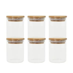 Esse é o conjunto do pote de vidro hermético redondo de 200ml para mantimentos com tampa de bambu da OIKOS.