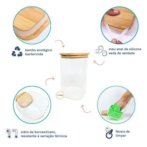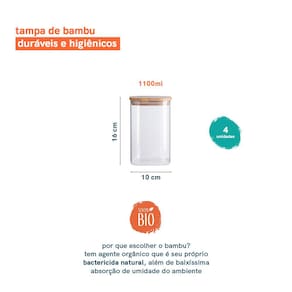 Potes De Mantimentos Quad 1100Ml C/Tampa Bambu - 4 Pçs
