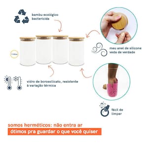 Esse conjunto é composto por 4 peças: 4 Unidades do POTE DE MANTIMENTOS DE 1100ML COM TAMPA DE BAMBU – OIKOS Altura: 18,7 cm Diâmetro: 9,5 cm