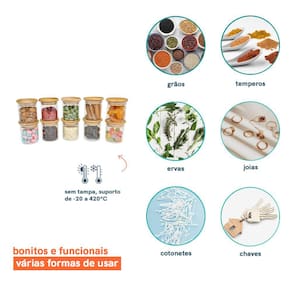 Empilhável: a tampa de bambu tem um rebaixo que possibilita encaixar a base de um pote na tampa de outro - uma ajudinha extra para aproveitar bem todo espaço que tem. Versátil e multiuso: além de condimentos, nele também cabe purpurina, algodão, conchas, moedas, peças de jogos, itens de escritório e outras pequenices que você quiser guardar - isso que é versatilidade! Design decorativo: funcional e bonito, esse potinho transita muito bem entre os ambientes e dá um toque decorativo por onde quer que vá - quarto, banheiro, cozinha, sala, escritório ou lavanderia, você que manda. Veda de verdade: além de ter uma beleza natural da combinação vidro e bambu, esse pote tem em sua tampa um anel de silicone que garante uma vedação total - conservando os alimentos por muito mais tempo. Higiênico e durável: o corpo é de vidro borossilicato bem resistente e a tampa é de bambu, um material que evita a proliferação de bactérias. Fácil de lavar: basta limpar com detergente neutro e guardar quando estiver tudo bem sequinho.