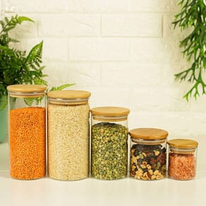 Esse é o kit de potes de vidro hermético redondo para mantimentos com tampa de bambu da OIKOS.