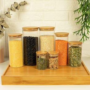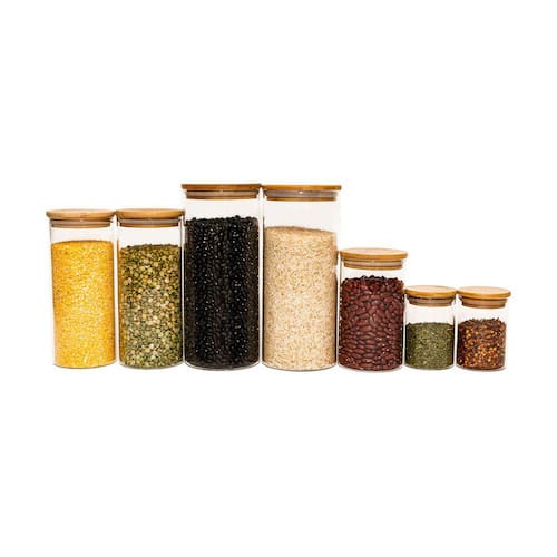 Esse é o Kit de 07 potes de vidro hermético para mantimentos com tampa de bambu da OIKOS.