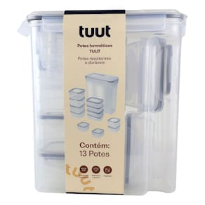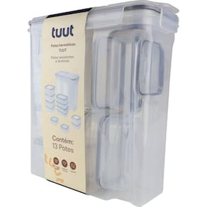 Marca: Tuut Material: Polipropileno e silicone (Plástico resistente) Validade: Indeterminada Linha: Utilidades Produto: Jogo de Potes Herméticos Quantidade: 13 potes Cor: Cinza (tampa e detalhes)