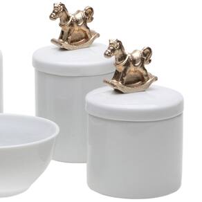 Para deixar seu bebê sempre cheirosinho este kit é perfeito Fabricados com materiais de altíssima qualidade e resistência, esse kit foi desenvolvido para facilitar o dia a dia das mamães, que precisam da praticidade de ter tudo devidamente armazenado e pronto para uso Dados Técnicos Kit higiene com porcelanas brancas decoradas com cavalinho dourado. Itens Inclusos no Kit 01 Pote grande em porcelana branca com tampa 01 Pote pequeno em porcelana branca com tampa 01 Molhadeira em porcelana branca 01 Porta ÁlcoolGel/ Sabonete Líquido em porcelana branca Medidas Pote Grande: 9 cm de diâmetro e 10 cm de altura Pote Pequeno: 9 cm de diâmetro e 8,5 cm de altura Molhadeira: 11,5 cm de diâmetro e 5,5 cm de altura Porta ÁlcoolGel/Sabonete Liquido: 6,5 cm de diâmetro e 15 cm de altura Ean: 7898659185574