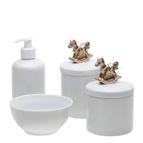 Para deixar seu bebê sempre cheirosinho este kit é perfeito Fabricados com materiais de altíssima qualidade e resistência, esse kit foi desenvolvido para facilitar o dia a dia das mamães, que precisam da praticidade de ter tudo devidamente armazenado e pronto para uso Dados Técnicos Kit higiene com porcelanas brancas decoradas com cavalinho dourado. Itens Inclusos no Kit 01 Pote grande em porcelana branca com tampa 01 Pote pequeno em porcelana branca com tampa 01 Molhadeira em porcelana branca 01 Porta ÁlcoolGel/ Sabonete Líquido em porcelana branca Medidas Pote Grande: 9 cm de diâmetro e 10 cm de altura Pote Pequeno: 9 cm de diâmetro e 8,5 cm de altura Molhadeira: 11,5 cm de diâmetro e 5,5 cm de altura Porta ÁlcoolGel/Sabonete Liquido: 6,5 cm de diâmetro e 15 cm de altura Ean: 7898659185574