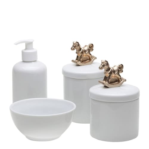 Para deixar seu bebê sempre cheirosinho este kit é perfeito Fabricados com materiais de altíssima qualidade e resistência, esse kit foi desenvolvido para facilitar o dia a dia das mamães, que precisam da praticidade de ter tudo devidamente armazenado e pronto para uso Dados Técnicos Kit higiene com porcelanas brancas decoradas com cavalinho dourado. Itens Inclusos no Kit 01 Pote grande em porcelana branca com tampa 01 Pote pequeno em porcelana branca com tampa 01 Molhadeira em porcelana branca 01 Porta ÁlcoolGel/ Sabonete Líquido em porcelana branca Medidas Pote Grande: 9 cm de diâmetro e 10 cm de altura Pote Pequeno: 9 cm de diâmetro e 8,5 cm de altura Molhadeira: 11,5 cm de diâmetro e 5,5 cm de altura Porta ÁlcoolGel/Sabonete Liquido: 6,5 cm de diâmetro e 15 cm de altura