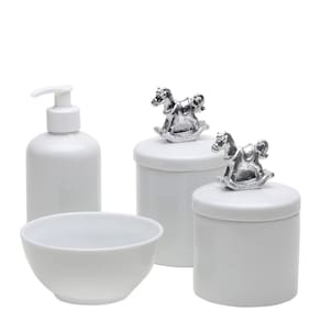 Para deixar seu bebê sempre cheirosinho este kit é perfeito Fabricados com materiais de altíssima qualidade e resistência, esse kit foi desenvolvido para facilitar o dia a dia das mamães, que precisam da praticidade de ter tudo devidamente armazenado e pronto para uso Dados Técnicos Kit higiene com porcelanas brancas decoradas com cavalinho prata. Itens Inclusos no Kit 01 Pote grande em porcelana branca com tampa 01 Pote pequeno em porcelana branca com tampa 01 Molhadeira em porcelana branca 01 Porta ÁlcoolGel/ Sabonete Líquido em porcelana branca Medidas Pote Grande: 9 cm de diâmetro e 10 cm de altura Pote Pequeno: 9 cm de diâmetro e 8,5 cm de altura Molhadeira: 11,5 cm de diâmetro e 5,5 cm de altura Porta ÁlcoolGel/Sabonete Liquido: 6,5 cm de diâmetro e 15 cm de altura Ean: 7898659185567