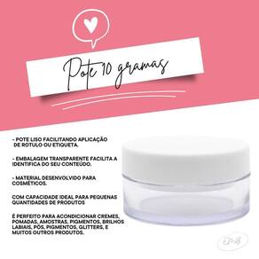 A transparência da embalagem permite uma fácil identificação do conteúdo, tornando o uso diário muito mais fácil e prático. Além disso, estes potes são fabricados com um material especialmente desenvolvido para cosméticos, garantindo a qualidade e segurança dos produtos armazenados.