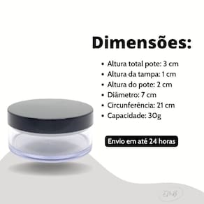 Especificações do Pote: Altura total pote: 3 cm Altura da tampa: 1 cm Altura do pote: 2 cm Diâmetro: 7 cm Circunferência: 21 cm Capacidade: 30g