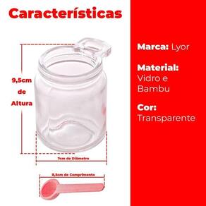 Potes De Vidro Porta Tempero Com Tampa Bambu 8cm X 8cm X 9,5cm Lyor Os potes de vidro porta tempero da Lyor, é feito de vidro com tampa de rolha e colher de bambu, possui aproximadamente 9,5cm de altura e 7cm de diâmetro, a colherzinha possui 8,5cm de comprimento. Este pote possui uma infinidade de utilidades, é perfeito para armazenar todos os tipos de temperos, para preparar doces de pote, chocolates, lembrancinhas e o que mais sua imaginação permitir.