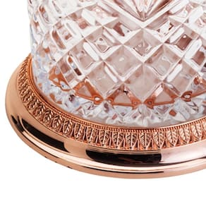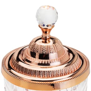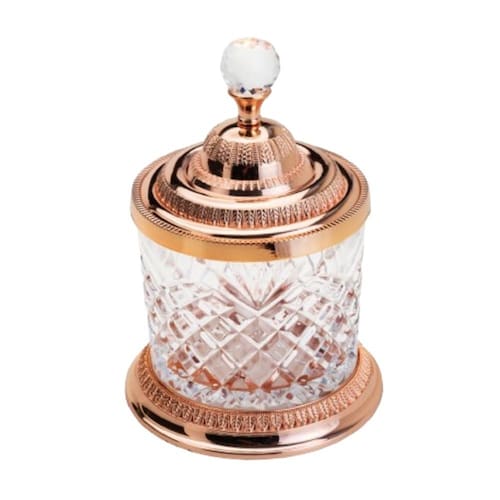 O Potiche Decorativo de Vidro C/Base e Tampa de Zamac Crystal Rosé 21,5x15cm da Lyor é um pote multiuso elegante, feito de vidro e zamac na cor rosê, ideal para decoração ou armazenamento de itens como balas e bombons.