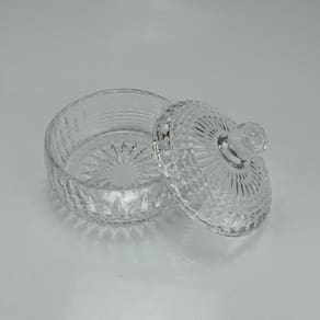 POTICHE COM TAMPA Altura: 12,5 cm Largura: 14,2 cm Profundidade: 14,2 cm Espessura: ,6 cm Peso: 1,14 Kg Diâmetro da Base: 12,5 cm Diâmetro do Topo: 13 cm Material: Vidro Cor: Transparente