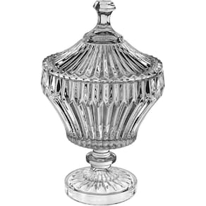 POTICHE COM TAMPA Altura: 28 cm Largura: 17,3 cm Profundidade: 17,3 cm Peso: 1,93 Kg Diâmetro da Base: 10,8 cm Diâmetro do Topo: 15,3 cm Material: Vidro Cor: Transparente