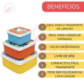 Conteúdo do Kit: 03 potinhos com tampas decoradas. Variedade Encantadora: 03 animais diferentes. Tamanhos: 200ml / 320ml / 500ml. Perfeito para Lanchinhos: Ideal para os pequenos intervalos do bebê. Compatibilidade: Vai ao micro-ondas, lava-louças e freezer. Segurança em Primeiro Lugar: Livre de BPA. Especificações Técnicas: