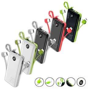 Power Bank com 3 cabos integrados (USB Tipo-C, Lightning, Micro USB), display digital LED indicador de bateria, mecanismo inteligente de controle de carga e descarga.Tipo