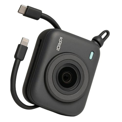 Power Bank compacto com design de minicâmera, capacidade de 10.000mAh, entrada Tipo-C, duas saídas (Lightning e Tipo-C), carregamento rápido de até 22.5W, material ABS + PC retardante de chamas, proteção de múltiplos circuitos, visor LED indicador e chip de reconhecimento de tensão inteligente. Possui carregamento por indução.Tipo
